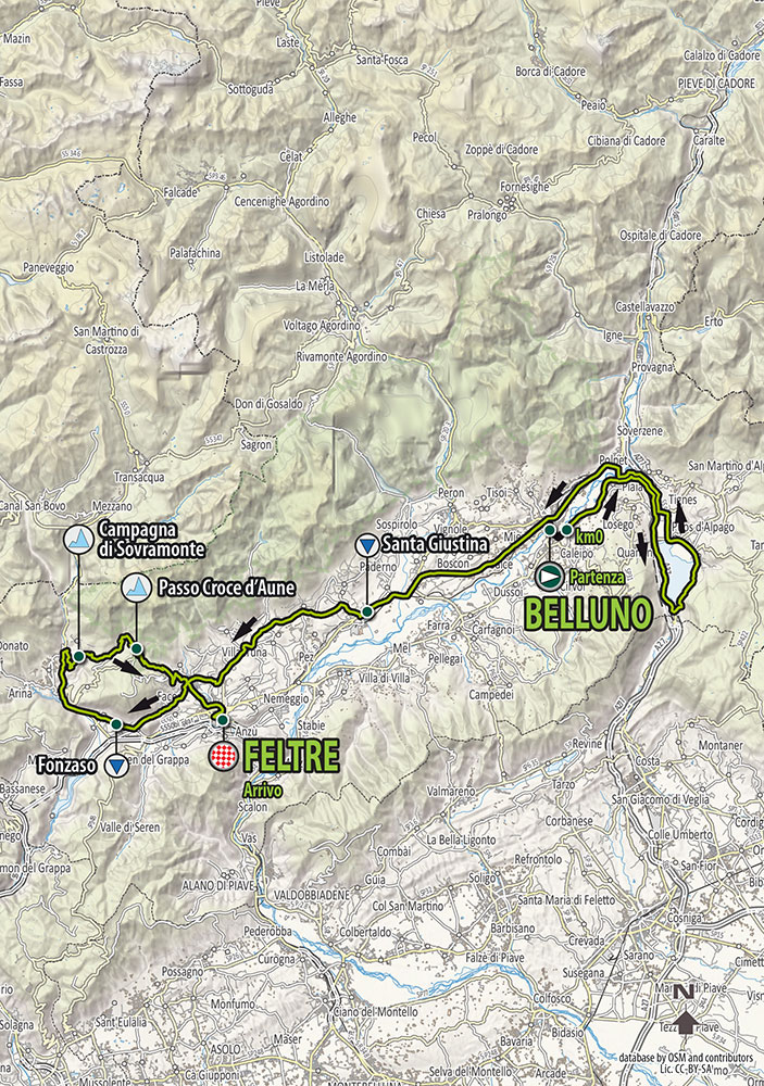 Trattasi della tappa in linea più impegnativa del giro, con partenza dal centro di Belluno e arrivo nel centro di Feltre. Km 0 in Via Miari SP01 dopo 3km che saranno percorsi a velocità controllata.