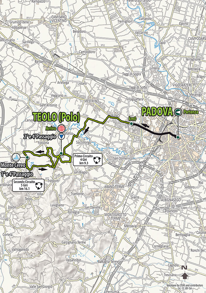 Ermenegildo dopo un trasferimento a velocità controllata di 6,8 km. Arrivo c/o la Z.I. delle Selve di Teolo di fronte alla Polo SPA. Giunti in Z.I. si percorrerà per 4 volte un circuito pianeggiate di km 9,360 e successivamente per 5 volte un circuito di km 16,090 che prevede la salita del Monte Cereo di km 1,9 e pendenza media del 4,7%, GPM al 1° e 4° passaggio. T.V. al 3° e 6° passaggio di fronte all’azienda Polo al km 37,860 e 79,400. Adeguatamente presidiato con personale a terra su tutti i punti nevralgici, presenza di scorta tecnica privata composta da nr 22 moto oltre alle 12 della Polizia Stradale.