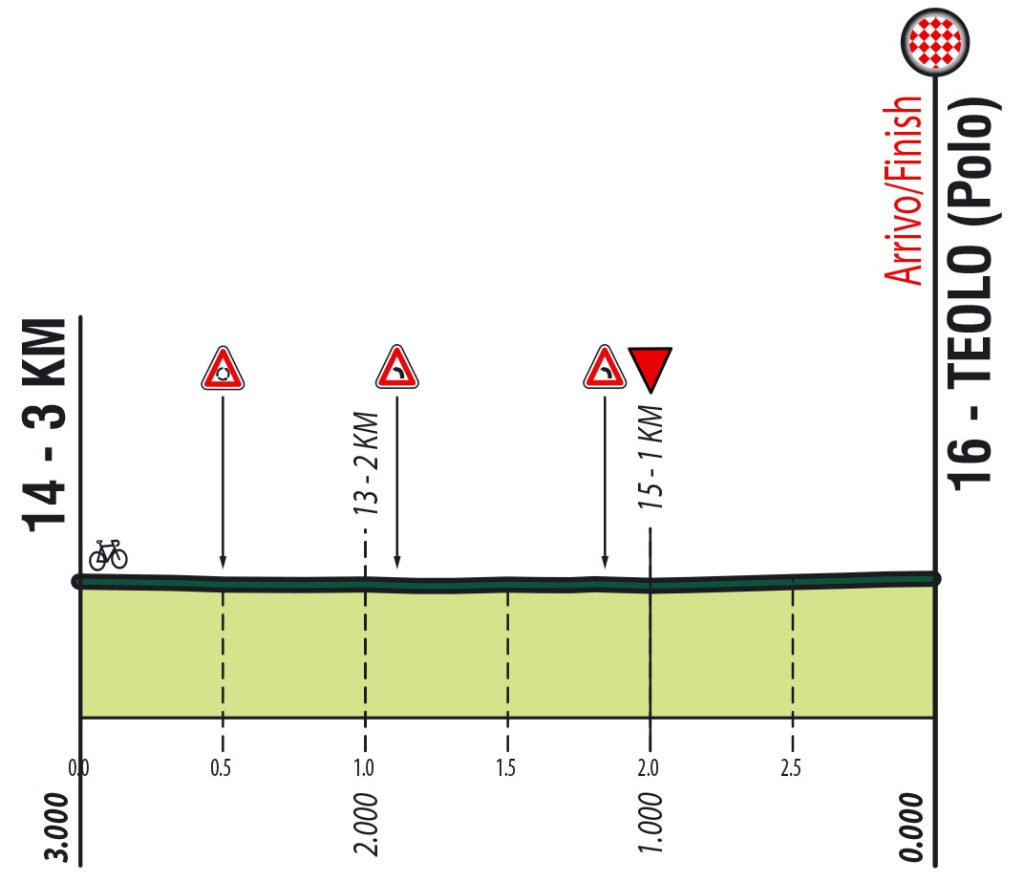 Trattasi della tappa in linea più lunga del giro, con partenza ufficiosa dal centro di Padova di fronte al Comune e partenza Km 0 in via della Provvidenza SR11 a Sarmeola di Rubano all’altezza dell’azienda Marini