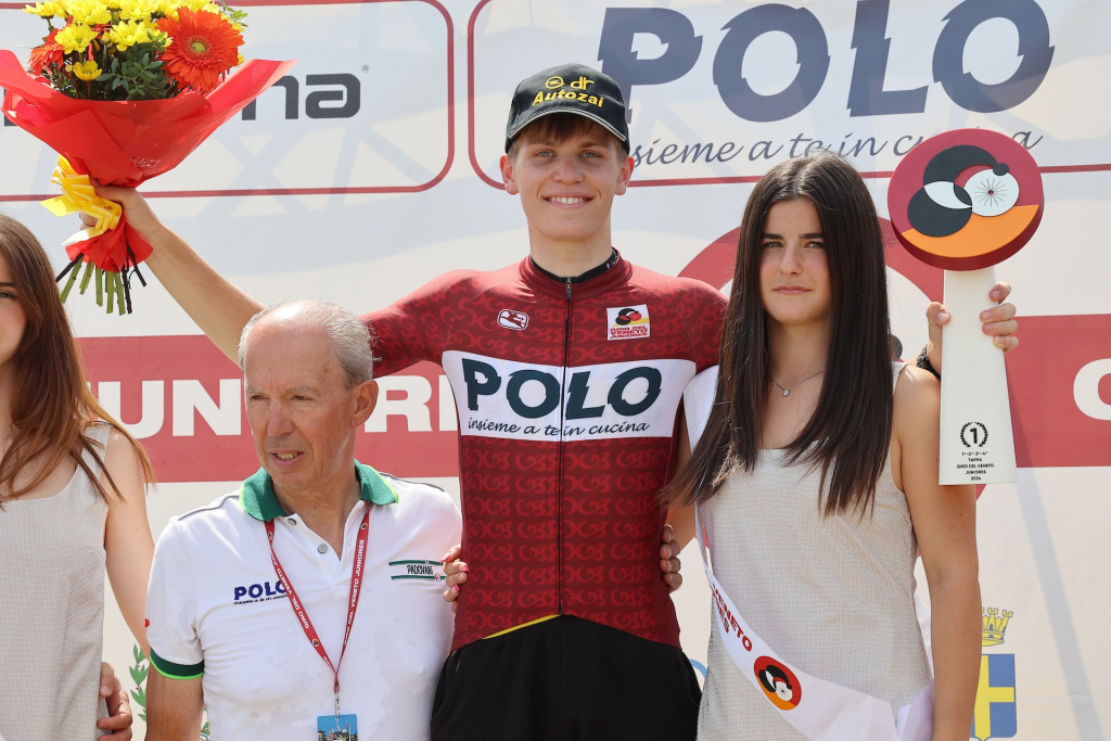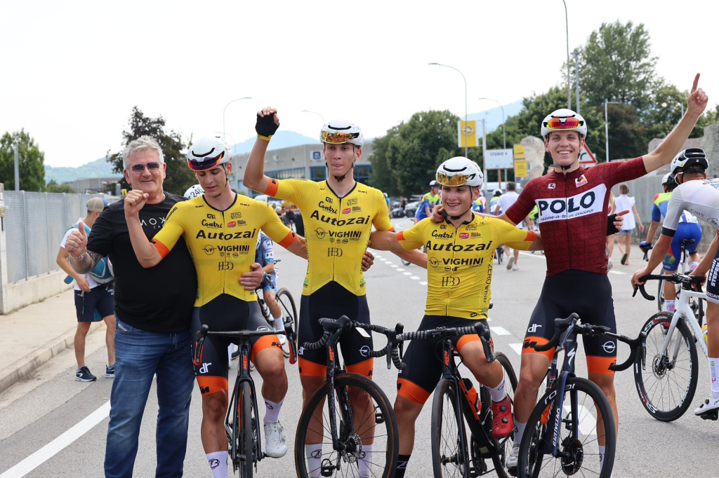 TEOLO – È monologo Autozai-Contri al Giro del Veneto Juniores 2024. La formazione veronese, già vincitrice della cronosquadre in Prato della Valle e ieri a Feltre, si è aggiudicata anche la frazione finale, la Padova-Teolo di 127,6 km, con il suo sprinter Alessio Magagnotti che si è imposto in una volata a ranghi quasi compatti davanti a Riccardo Fabbro (Ind. Forniture Moro-C&G Capital) e Filippo Cettolin (Borgo Molino-Vigna Fiorita). La festa è completata dal trionfo in generale di Erazem Valjavec, che è salito sul gradino più alto del podio, allestito nel bellissimo giardino dell’azienda Polo Spa, insieme ad Andrea Bessega (Borgo Molino-Vigna Fiorita), secondo, e Tommaso Quaglia (Team Giorgi), terzo.