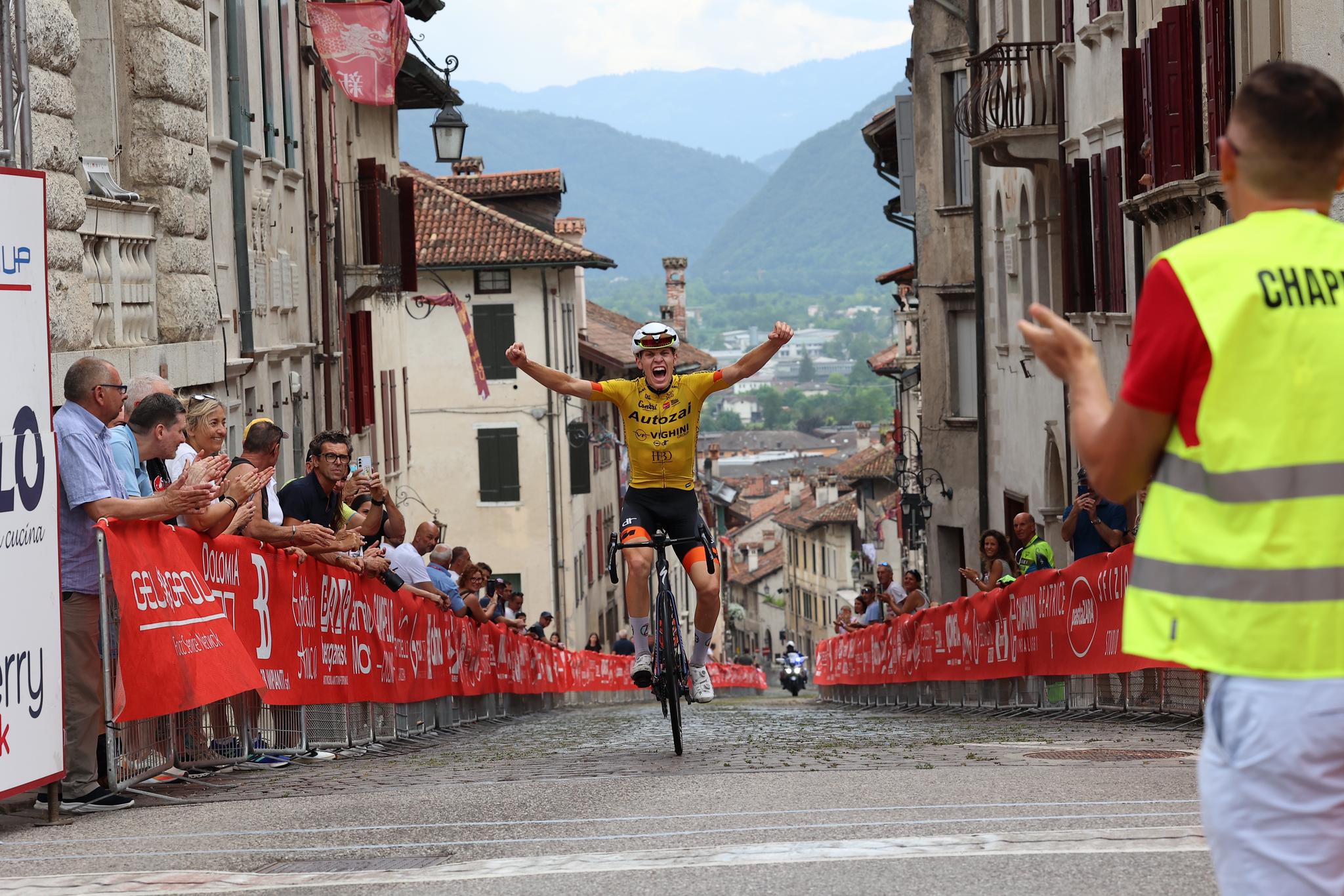 Col gruppo ridotto a una ventina di unità, salendo verso il Croce d’Aune, Erazem Valjavec ha voluto concludere il grande lavoro dei compagni, scattando e mandando in frantumi il gruppo dei favoriti. Inizialmente lo hanno seguito David Zanutta e, per pochissimo, anche il colombiano Santiago Herreno (Team Giorgi), che però ha presto perso contatto. Quando anche il corridore friulano si è dovuto arrendere al ritmo di Valjavec, lo sloveno non si è più guardato indietro, scollinando da solo e lanciandosi verso il traguardo di Feltre. Lo strappo finale di Via Mezzaterra per arrivare in Piazza Maggiore è stata per lui poco più che una passerella. Conquistata la Maglia Rossa Polo, sarà molto difficile portargliela via domani.